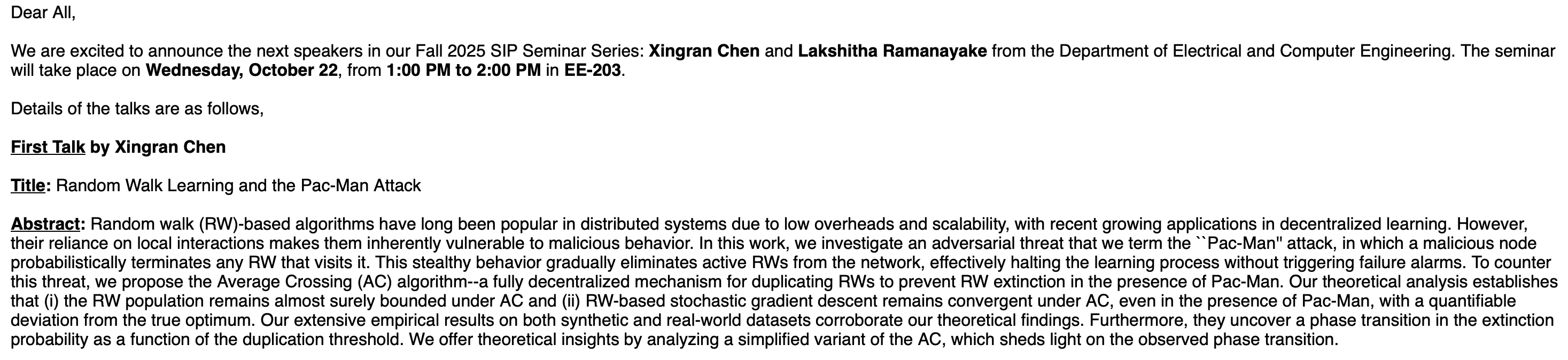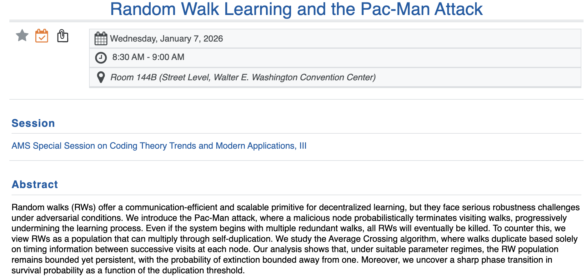 Rutgers University, New Brunswick, USA, 2025, topic: Random Walk Learning and the Pac-Man Attack. [Pictures]